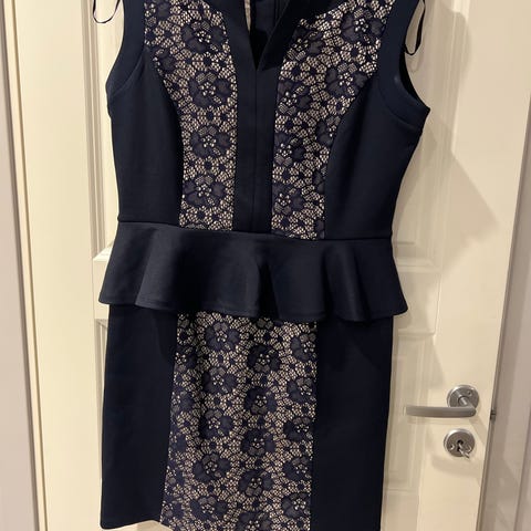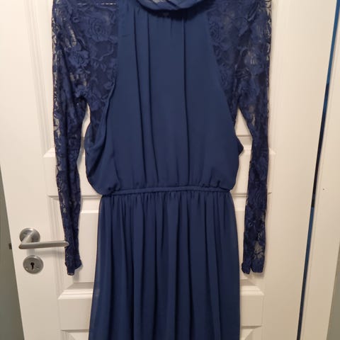 Selger en pent brukt mørk blå knelang kjole i str. S fra Vero Moda. Den er brukt et par ganger. Den har innsving i midjen, er stretchy og har v-utringning foran og bak dekket med et blondestoff.