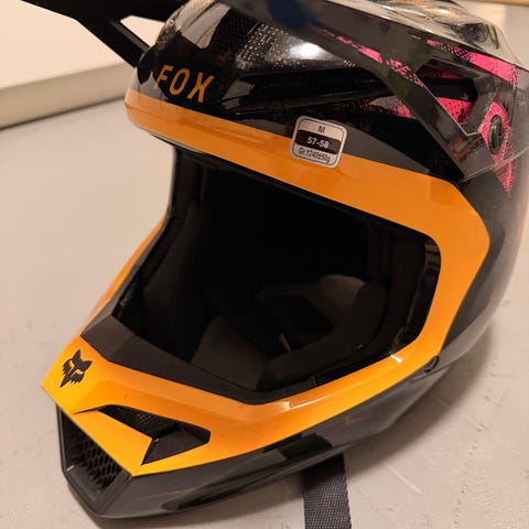 Fox Rockstar Energy helhjelm i svart med gule og hvite detaljer. Modellen har heldekkende design med hakebeskyttelse og ventilasjonsåpninger. Polstret innside med kinnputer og justerbar hakestropp med spennelukking. Grafikk med Rockstar Energy-logo på sidene og toppen av hjelmen. Egnet som helhjelm til motorsport eller lignende bruk der full ansiktsbeskyttelse er ønsket.