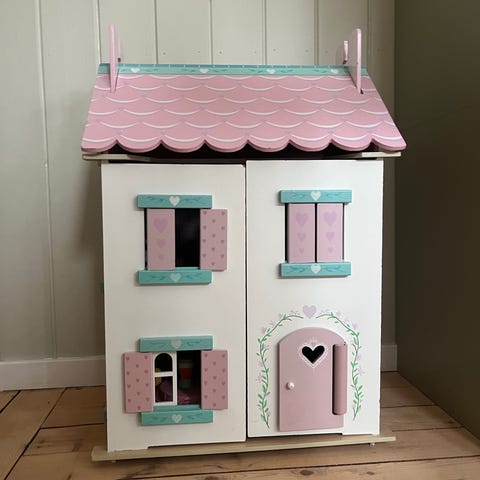 Dukkehuset er møblert og har vinduer og tak som kan åpnes. Det følges også med Lundby Charlie Family dukkesett og to stk Sylvanian mus.