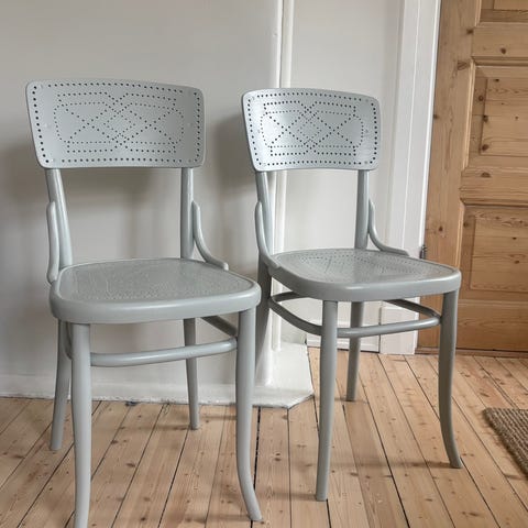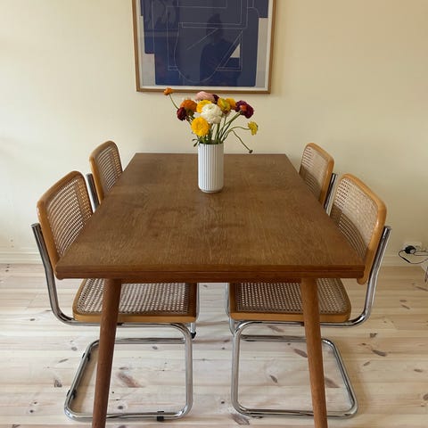 Vintage stoler med plast-rotting (veldig praktisk da det faktisk er mer slitesterkt enn tre-rotting). God stand, men har endel bruksmerker. Dette er ikke noe vi har tenkt på da det ikke vises spesielt godt i helhetlig inntrykk. Noe av det går sikkert bort i vask og💫