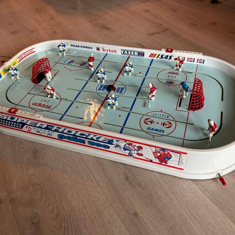 Stiga Play Off 21 bordhockeyspill. Klassisk ishockeyspill med plastbane, målbur og bevegelige spillere festet på stenger. Stangen til én av spillerne er anelse bøyd, men er fullt brukbart. Banen har trykte reklamelogoer og markeringer som på en ishockeybane. Leveres med instruksjonshefte og tilbehør som vist på bildene. Egnet som bordspill for flere spillere.