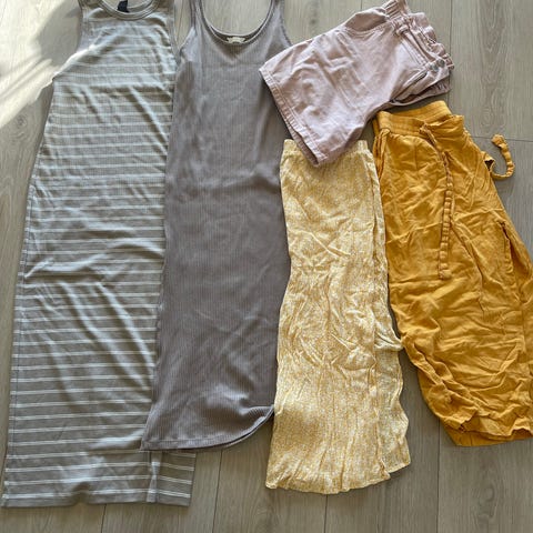 Klespakke dame, sommer. Str 44,46. Prikkete kjole, heklejakke, deminskjørt m.m.