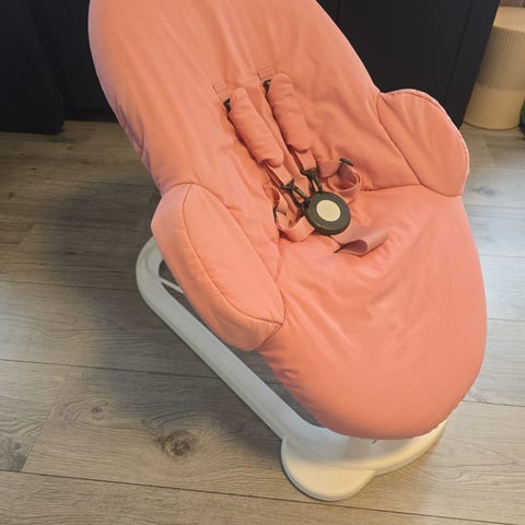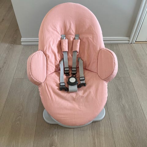 Stolen har fotbrett som kan justeres i høyden, og sete som gir støtte til barnet ved måltider og lek ved bordet. Baby vippestol i rosa tekstil har integrert sele for og ekstra innlegg for spedbarn, og det følger også med et polstret seteinnlegg i mønstret blått stoff til bruk når barnet kan sitte selv (småbarns delen). Stolen kan brukes fra spedbarnsalder med babyinnlegg og senere som høy barnestol ved bordet.