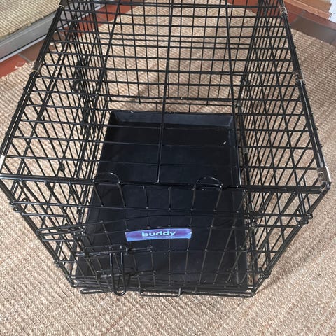 Hundebur i metall i svart farge. Buret har bærehåndtak på toppen og gitterkonstruksjon rundt.