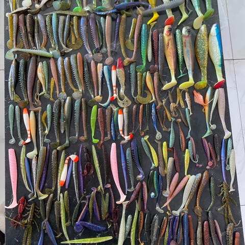 Blandede jigghaler og gummiagn til fiske i ulike størrelser og fasonger. Settet består av flere myke plastagn med hale, noen med monterte jigghoder og kroker. Fargene varierer blant annet i gult, rødt, grønt, brunt og naturfarger, med både ensfargede og glitrende varianter. Egnet til ferskvanns- og sjøfiske av ulike rovfiskarter, avhengig av rigging og vekt på jigghodene. Agnene kan brukes med tradisjonelle jiggoppsett på spinnstang eller annen passende fiskeutrustning.