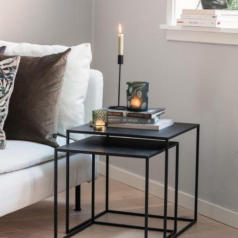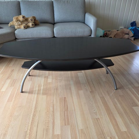 Selger et stilrent og solid sofabord fra Kleppe Møbelfabrikk (modell Bow). Bordet har en flott, mørk bordplate og moderne ben i børstet stål. Det har også en praktisk underhylle til oppbevaring av fjernkontroller, blader og lignende.