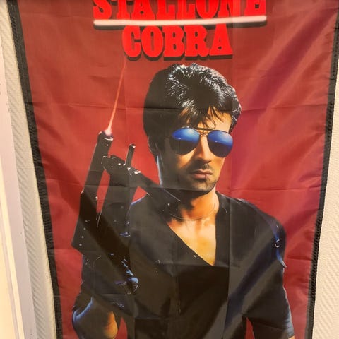 First Blood film banner (polyester)med motiv fra filmen. Plakaten viser hovedpersonen i øvre del og filmtittelen «First Blood» i stor skrift nederst. Egner seg til innramming og veggdekor i for eksempel stue, kontor, kino- eller spillrom.
