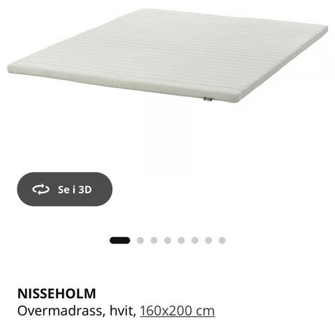 IKEA Näsfjället overmadrass i størrelse 160x200 cm. Tykkelse ca. 4 cm. Farge hvit. Overmadrassen gir et ekstra mykt lag over madrassen og kan brukes på dobbeltseng i tilsvarende størrelse. Trekket kan tas av og vaskes i henhold til vaskeanvisning på produktet.