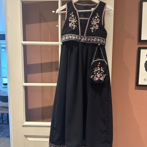 Blå løken bunad brodert av husfliden Fredrikstad. Med Lue og Veske.