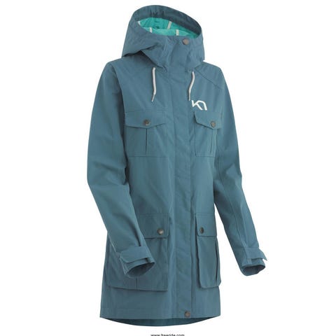 Kari Traa Skalljakke for dame i størrelse S. Jakken er laget i polyester og har hette, fargen er hovedsakelig svart med kontrastfelt i grå/blå og detaljer i rosa.