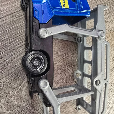 Leketøyet på bildet er en biltransport-lastebil med en integrert bilbane-funksjon. Denne typen leke er designet for å både kunne transportere småbiler og fungere som en utfellbar rampe eller racerbane.