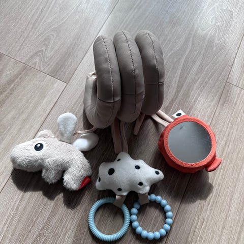 Done by Deer aktivitetsleke spiral i blåtoner. Myk spiral som kan festes rundt f.eks. vogn, bilstol eller sprinkelseng. Inkluderer flere hengende myke figurer og elementer i tekstil, blant annet kosedyr og ring. Egnet som sanseleke for baby med ulike strukturer å ta på og se på.