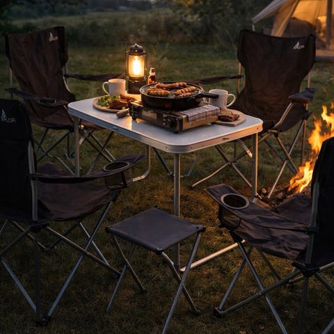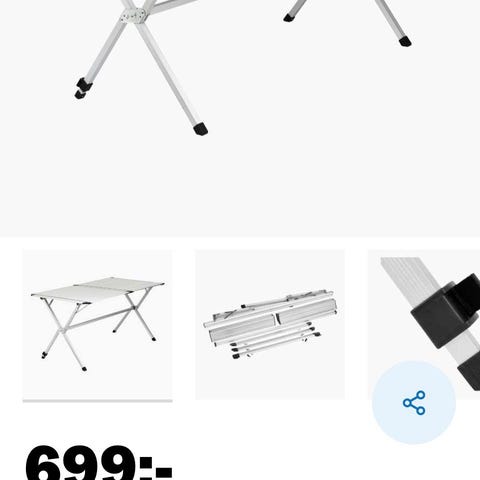 Sammenleggbart campingbord i aluminium med plate av lameller. Bordet står på fire ben og kan klappes helt sammen. Leveres med egen bærebagen i blått stoff med glidelås og bærehåndtak. Egner seg til bruk på camping, tur, hytte eller som ekstra bord ved behov. Lett konstruksjon som gjør det enkelt å transportere og oppbevare når det ikke er i bruk.