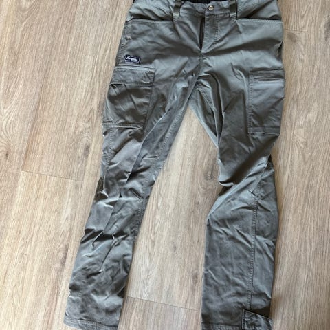 Bergans turbukse i grønn farge. Buksen er laget i 100 % polyester med nettingfôr i livet. Den har flere cargolommer på sidene, glidelåslomme foran og justering med borrelås nederst på beina. Passer til friluftsliv og turbruk. Størrelse er merket med «M» på innsiden.