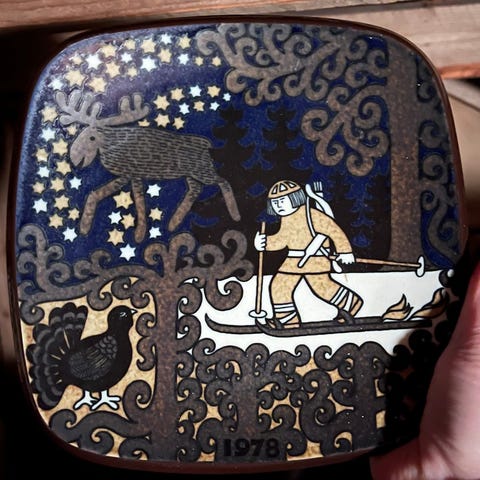 Tallerkenen viser en vinterscene med en sameleir (Kotakylä på finsk).
