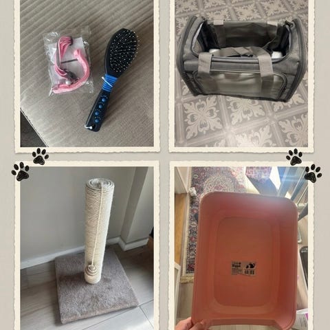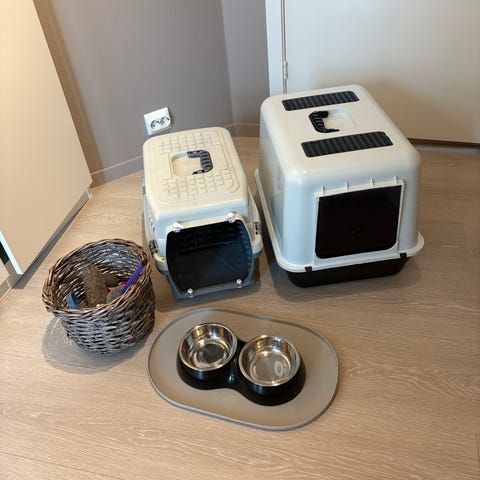Vi mistet katten vår i en påkjørsel og derfor selger vi katteutstyr med flere produkter.. Settet inneholder blant annet transportbur du kan bære på ryggen, lukket dokasse xxl stor utgave, kattesand, liten klorestolpe, nytt fôr til main coon nesten full og mm se bilde. Egnet til innendørs bruk for katt, for oppbevaring av fôr, transport og toalettløsning.