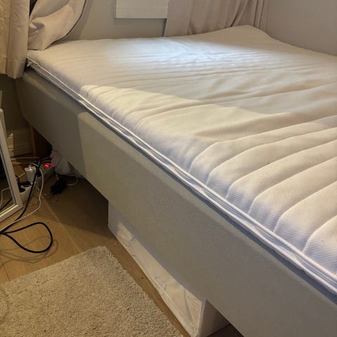 Seng med skuffer og oppbevaring på begge sider, 160 cm bred med oppbevaringsplass i sengegavel. Kun brukt som gjesteseng og derfor veldig pent brukt. Obs - madrass til ramme følger med, men ikke overmadrasse og ikke hund😉