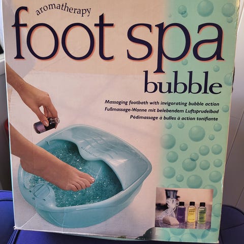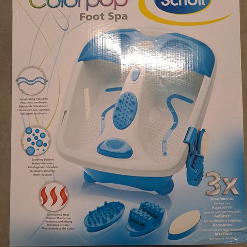 OBH Nordica fotbad i blå og hvit plast. Enheten har kontrollhjul med flere innstillinger for massasje og varme, samt strukturert bunn med massasjeruller for fotsålen. Egnet for fotbad og enkel fotpleie hjemme. Drives med strøm via ledning.