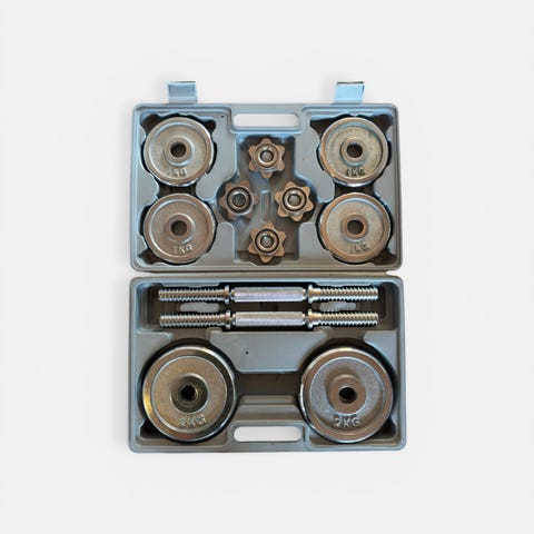 Manualsett levert i koffert. Settet ineholder to rette manualstenger og 10 kg skiver 4 x 0.5 + 8× 1 kg.
