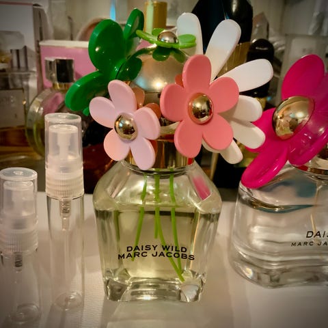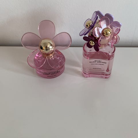 Marc Jacobs Daisy og Perfect dameparfymer i blandet sett. Bildene viser flere varianter av Daisy-serien, blant annet Daisy Eau So Fresh og Daisy Paradise, samt en flaske fra Perfect-serien. Flaskene har karakteristiske blomster- og dekorlokk i ulike farger. Egner seg som parfymer til dame. Nøyaktig mengde og duftnoter fremgår av etikettene på hver enkelt flaske.