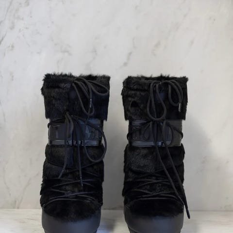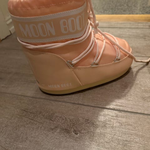 Moon Boots i størrelse 35-38. Modellen har overdel i hvit shearling med brune detaljer i 100% skinn og snøringer rundt fot og skaft. Innvendig er støvlene fôret med mykt materiale for ekstra varme. Yttersålen er i gummi med mønster for bedre grep på underlaget. Egner seg til bruk på kalde dager og i snøforhold.