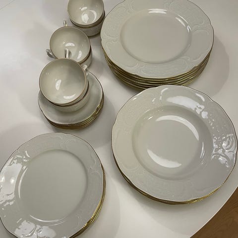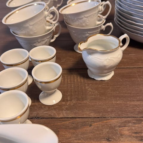 Klassisk hvitt porselen med elegant gullkant. Serviset er pent brukt og i veldig god stand. Ingen skår eller skader.