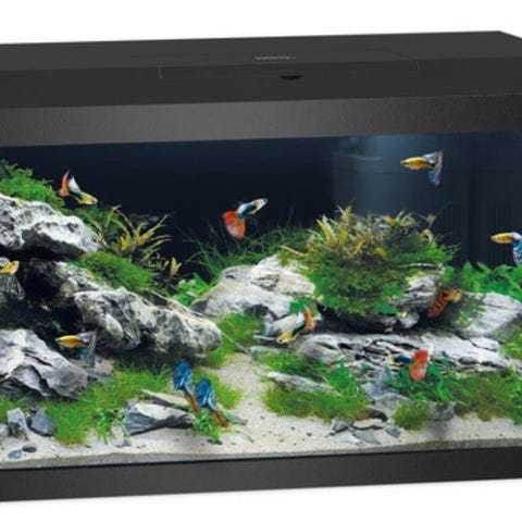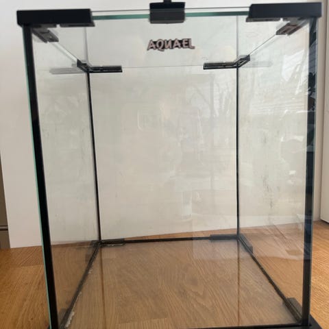 Akvarium med rektangulær glasskumme og hvitt lokk. Akvariet har innebygd filtreringssystem i lokket med filtermateriale og nedsenkbar pumpe. I lokket er det integrert LED-belysning langs hele lengden. Bunnen er kledd med blå plate, og bakveggen har dekorativ bakgrunn. Egnet til hold av mindre akvariefisk eller reker, forutsatt riktig tilpasning av utstyr og innredning.. Mål 21/47/48 cm. Volum cca 45L.