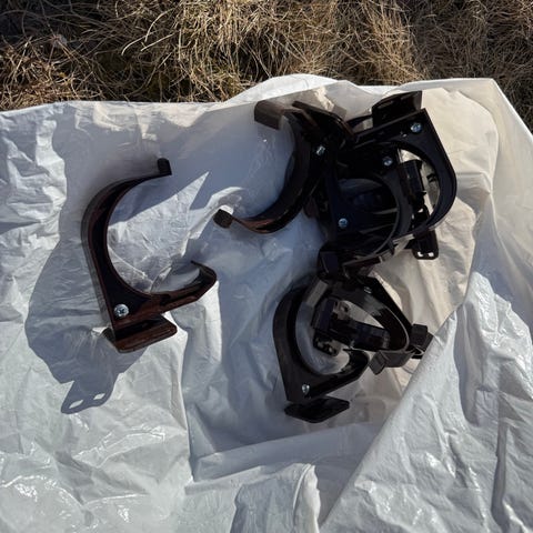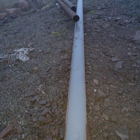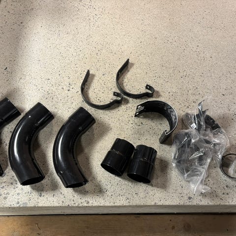 Umerkede rørdeler i aluminium i svart farge. Pakken inneholder flere bøyde rørseksjoner, T-stykke og rørklemmer/festebånd. Til takrenner.