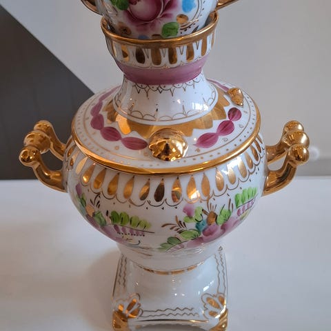 Liten antikk parafinlampe porselen blomsterdekor hvit rød