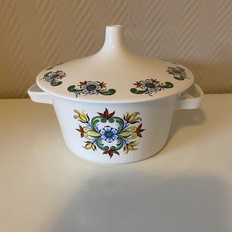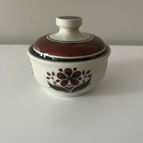 Pen Liten skål med lokk Figgjo Valle. Lokket har et lite nagg under, lite synlig når lokket er på. Ellers er den hel og blank i glasuren.