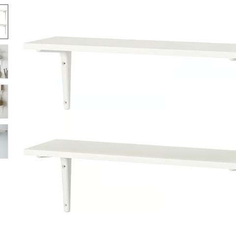 To hvite vegghyller fra IKEA, BERGSHULT / GRANHULT. Hyllene er i god stand. Den ene hyllen har fire skruehull på undersiden etter at det har vært festet en hylle på undersiden.