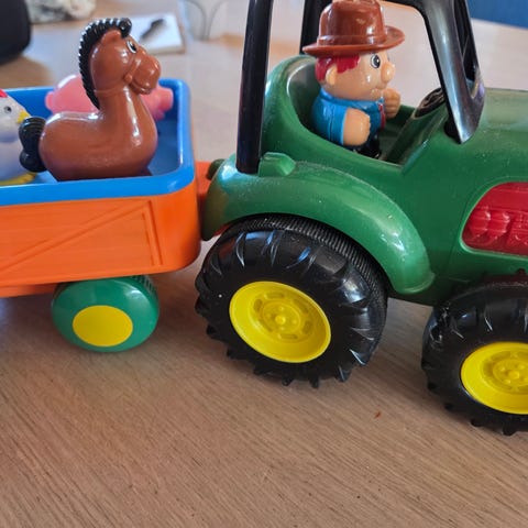 Selger en traktor med henger og bondegårdsdyr leker. Traktoren har to funksjoner for å lage lyd.