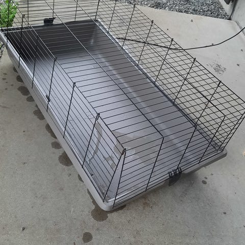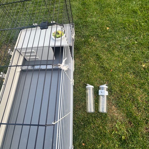 Metallgitter med flere åpninger for tilgang til buret. Underdelen er en dyp plastbunn i grå farge som holder strø og underlag på plass. Passer til mindre kjæledyr som kanin, marsvin eller andre smågnagere.