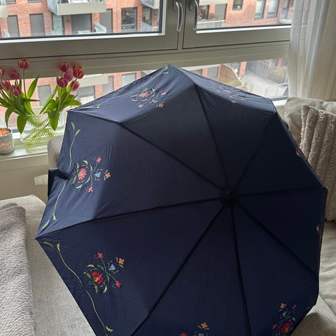 Helt ny bunadsparaply. Aldri brukt. Lappen på. I plast. Følger med eget etui til paraplyen.