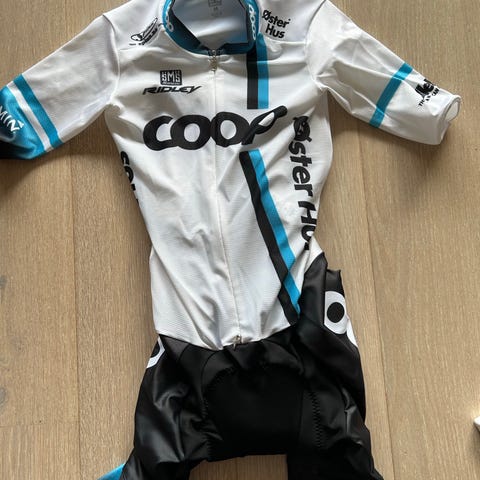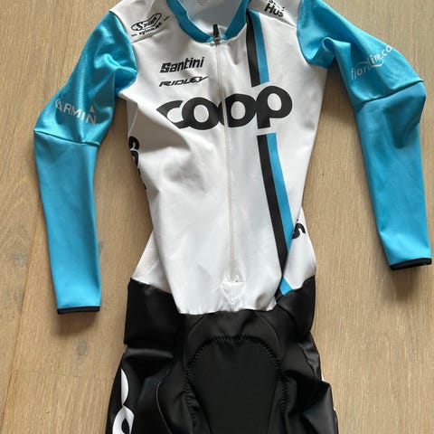 Selger én helt ny og ubrukt (med merkelapper) Team Coop 2021 speedsuit/skinsuit, i Str. Small. Santini sin raskeste sykkelbekledning, som brukt av lag som Lidl-Trek, og i Tour de France.