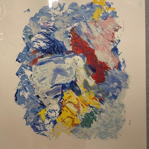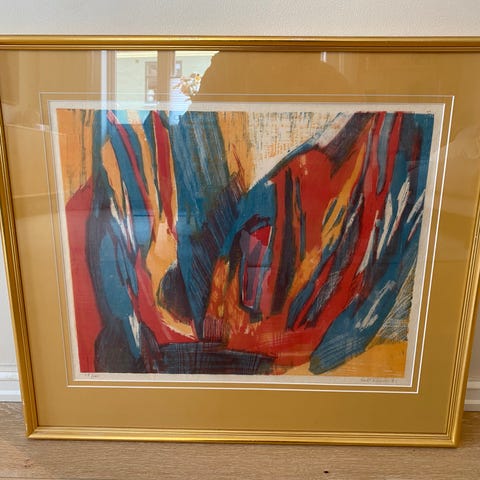 Abstrakt kunsttrykk i sterke farger, innrammet med passepartout og ramme i lys tone med gullkant. Motivene består av ekspressive penselstrøk i blant annet grønt, rødt, blått og gult. Bildene er montert bak glass og rammen har klassisk, enkel profil.