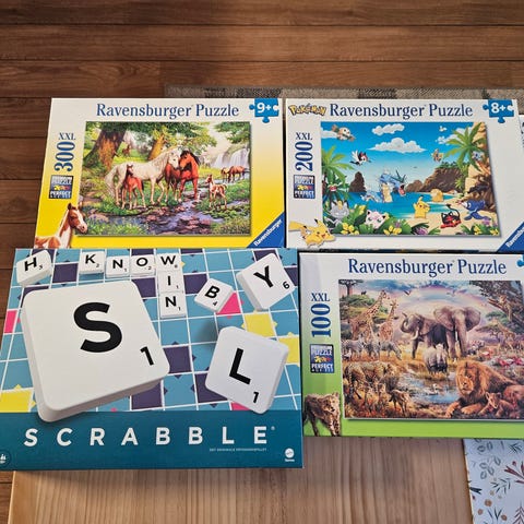 Pakke med ulike brettspill og puslespill med blandede motiver og spill . Bildene viser flere puslespill med blant annet hestemotiv, bil og blomster, landskap og Trolls-motiv, samt brettspill som Ludo, Vildkatten, Takenoko og Sudoku-spill. Spillene og puslespillene har varierende vanskelighetsgrad og antall brikker, egnet for både barn og voksne avhengig av spilltype og motiv. Passer til familiebruk, fritidsaktiviteter og som innendørs tidsfordriv.