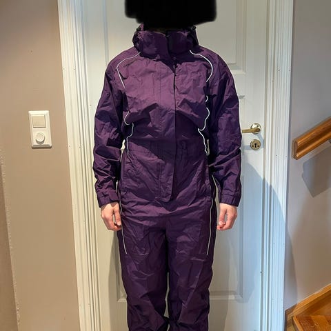 Blå Hoppindress for dame i størrelse S. Størrelsen heter S-k, altså at den er kort i beina. Den er lite brukt, vasket en gang etter vaskeanvisningen. Veldig god dress. Den er snurpet inn på bildene. Har borrelåser i sidene, så den kan stilles inn til ønsket omkrets. Personen på bildet er 160 cm høy.
