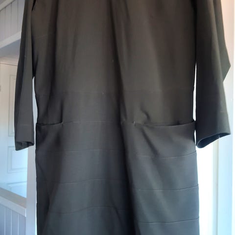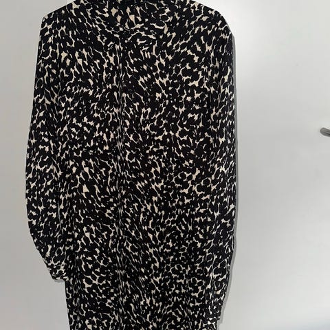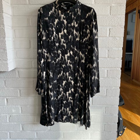 Bitte Kai Rand kjole i størrelse M. Kjolen er laget av 100 % viskose og har et svart-hvitt, organisk mønster. Modellen har krage, lommer og knepping foran. Stoffet er lett og faller mykt. Passer som hverdagskjole eller til en enkel, penere anledning.