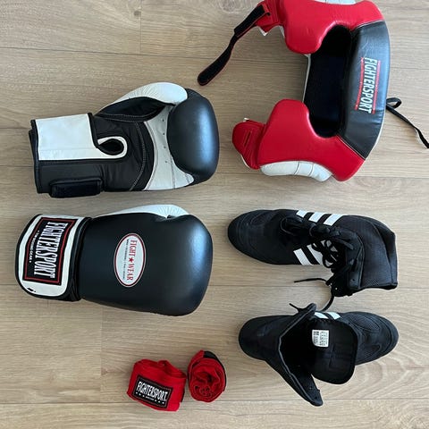 Komplett sparringsutstyr med bag, uåpnet. Kjøpt til jente 10 år (høy for alderen), så utstyret er fra størrelse xs til m.