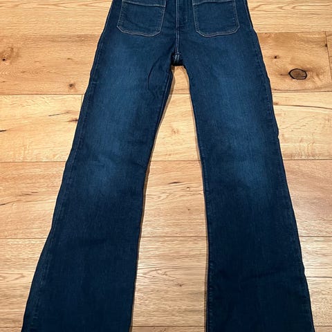 Jeansen har klassisk femlommers-inspirert design med påsydde lommer foran og bak, beltehemper og lukking med knapp