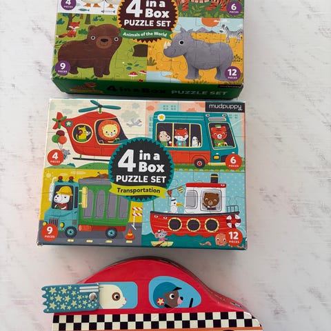 Djeco puslespillsett for barn med flere ulike modeller. Settet inkluderer blant annet «Le camion de pompiers» brannbilpuslespill med 16 brikker i metallkoffert, «Puzzle trio Stories» med 8 små puslespill som danner historier i tre deler, samt «Puzzle duo Chiffres/Numbers» med 10 to-delte puslespill som kombinerer tall og motiver. Puslespillene har fargerike illustrasjoner og er merket 3+ år. Egnet til tidlig læring av tall, sekvenser og historiefortelling,