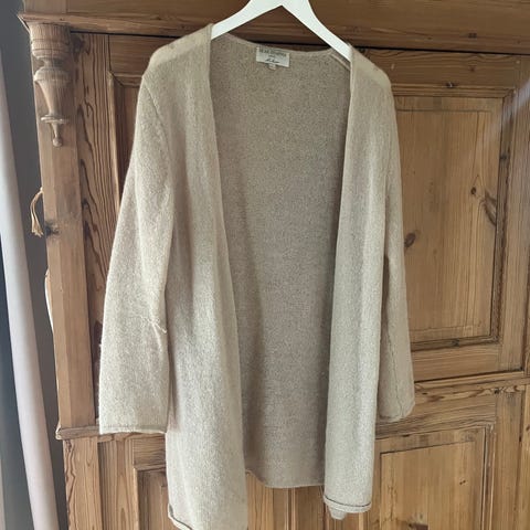 Nydelig Dear Dharma cardigan i mohairull for dame i størrelse L. Cardiganen er beige og har rund hals, knappelukking foran og ribbestrikk nederst og på ermene. Modellen har dekorative dusker/strukturstrikk på forstykke, bakstykke og ermer.