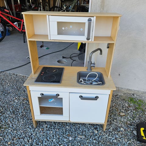 IKEA lekekjøkken. Kjøkkenet har integrert vask med kran og to markerte kokeplater på toppen. Under benken er det en dør som kan brukes som ovn eller skap, samt åpne hyller til oppbevaring av lekekjøkkenutstyr. Passer til innendørs