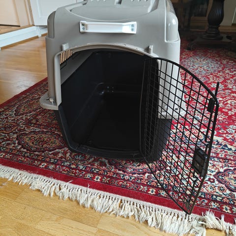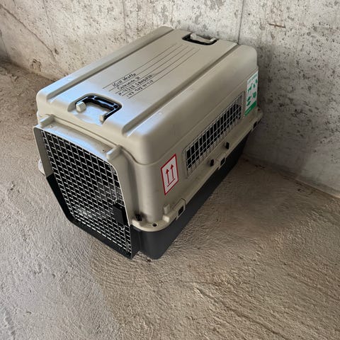 Transportbur til hund og katt i plast, i svart og grå farge. Buret har gitterdør i metall med låsemekanisme i front. God ventilasjon gjennom luftespor på sidene og toppen. På toppen er det integrerte oppbevaringsrom med lokk for småting som bånd eller poser. Egnet til transport av mindre dyr i bil eller til kortere reiser. Størrelse: høyde 60 cm, bredde 79 cm, dybde 49cm.