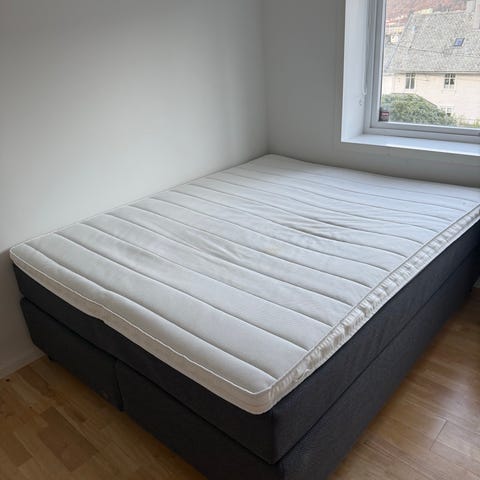 IKEA seng med madrass. Rektangulær seng med lys grå sengebunn og hvit overmadrass/madrass. Passer til bruk på soverom eller gjesterom. Egnet for én person eller to personer avhengig av mål. Sengen står på ben som gir plass under til enkel rengjøring eller oppbevaring.