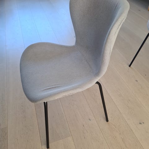2 stk spisestuestoler fra KID selges rimelig. Brune, stoffet minner om semsket skinn, men disse er i syntetisk materiale. Bein i sortlakkert metall. Nesten ubrukte, stått på et gjesterom i et par år. Kjøpt nye i 2022. Må hentes. Selges samlet for 200,- eller 100,- pr stk