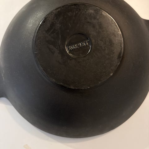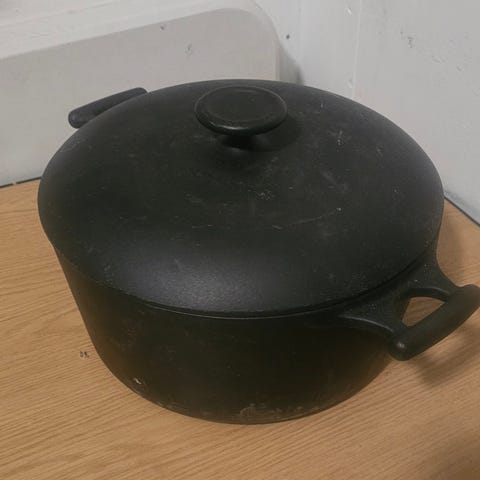 Pent brukt wokpanne i støpejern selges med rist og lokk. 37 cm i diameter.