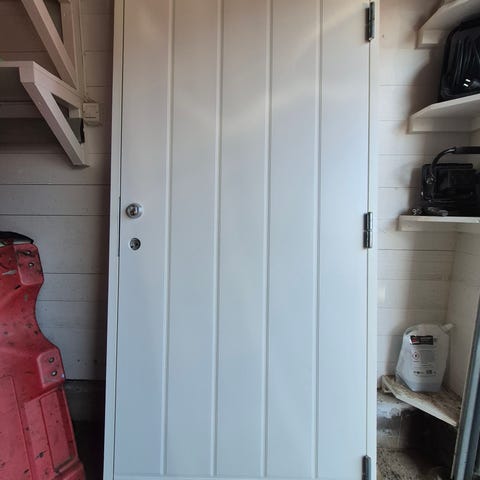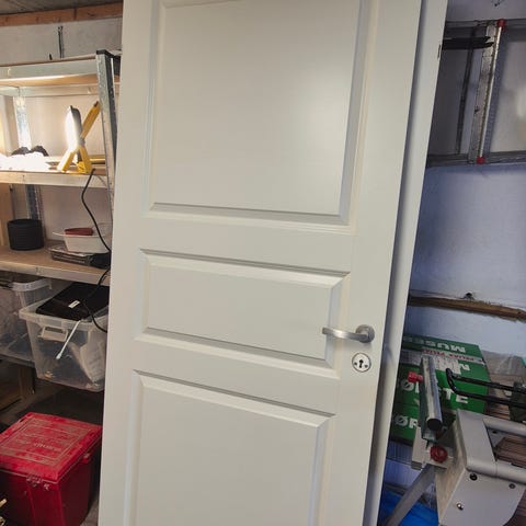 Ytterdør med klassisk paneldesign. Døren har hvit innside og svart utside, med fire rektangulære fyllinger. Leveres med karm etter det som vises på bildene, samt montert låskasse og dørhåndtak.