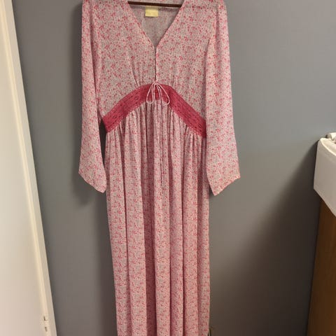 sommerkjole i bomull for dame i størrelse XL fra Agencies Turquoise . ( mer som str L ) Kjolen er flerfarget med hovedsakelig rosa og beige toner og har et mønstret stoff med broderte detaljer. Modellen har 3/4-lange ermer, lengde ned mot ankelen og dekorativt bånd med dusk i glidelåsen på siden i livet. Nederst har kjolen en kontrastfarget kant og splitt på hver side. Passer som lett sommerkjole , den er lett og sval.